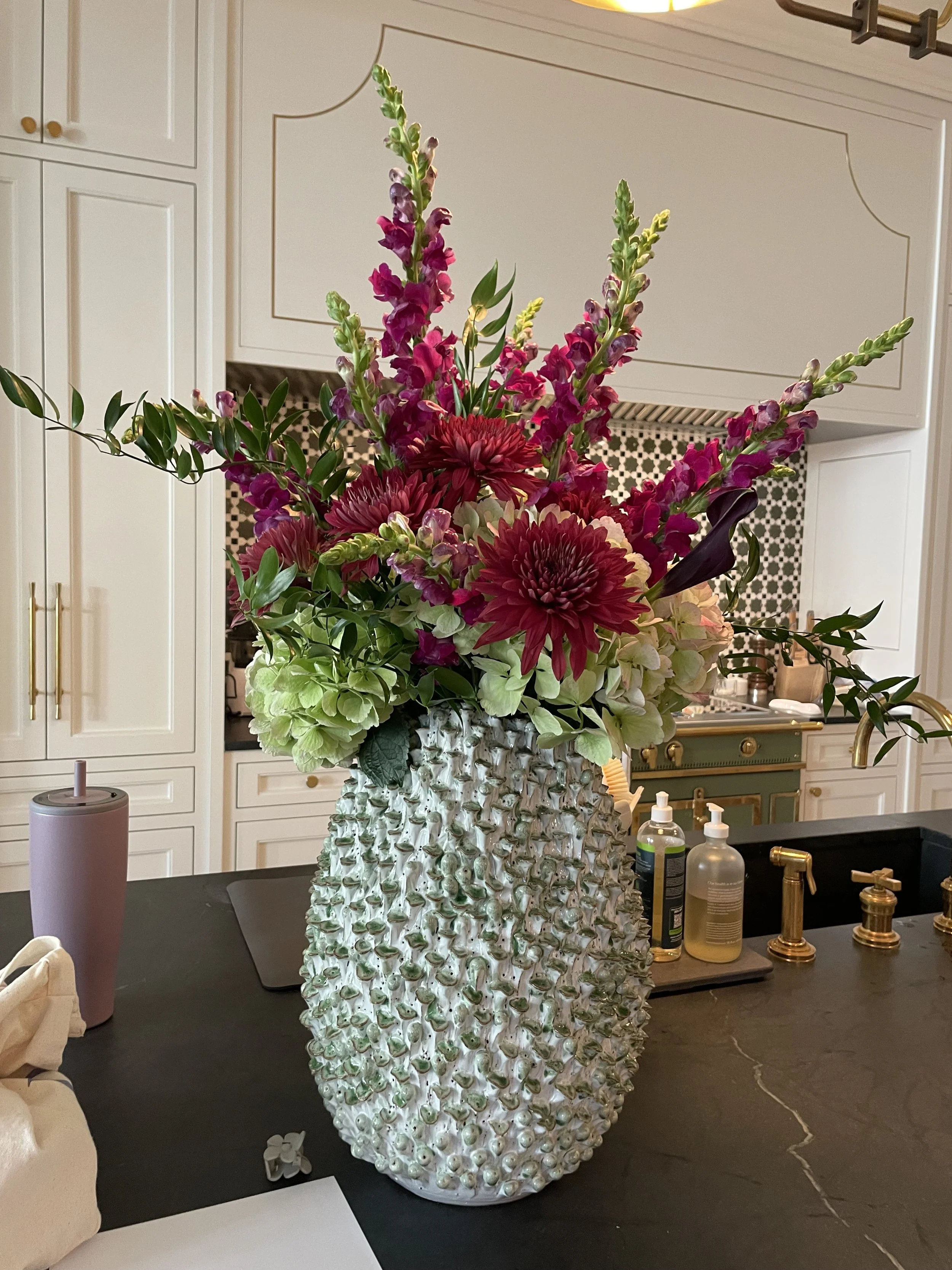 Colorful flower arrangement with various blooms on a black table, including red poppies, blue carnations, pink snapdragons, yellow billy balls, and green foliage.
