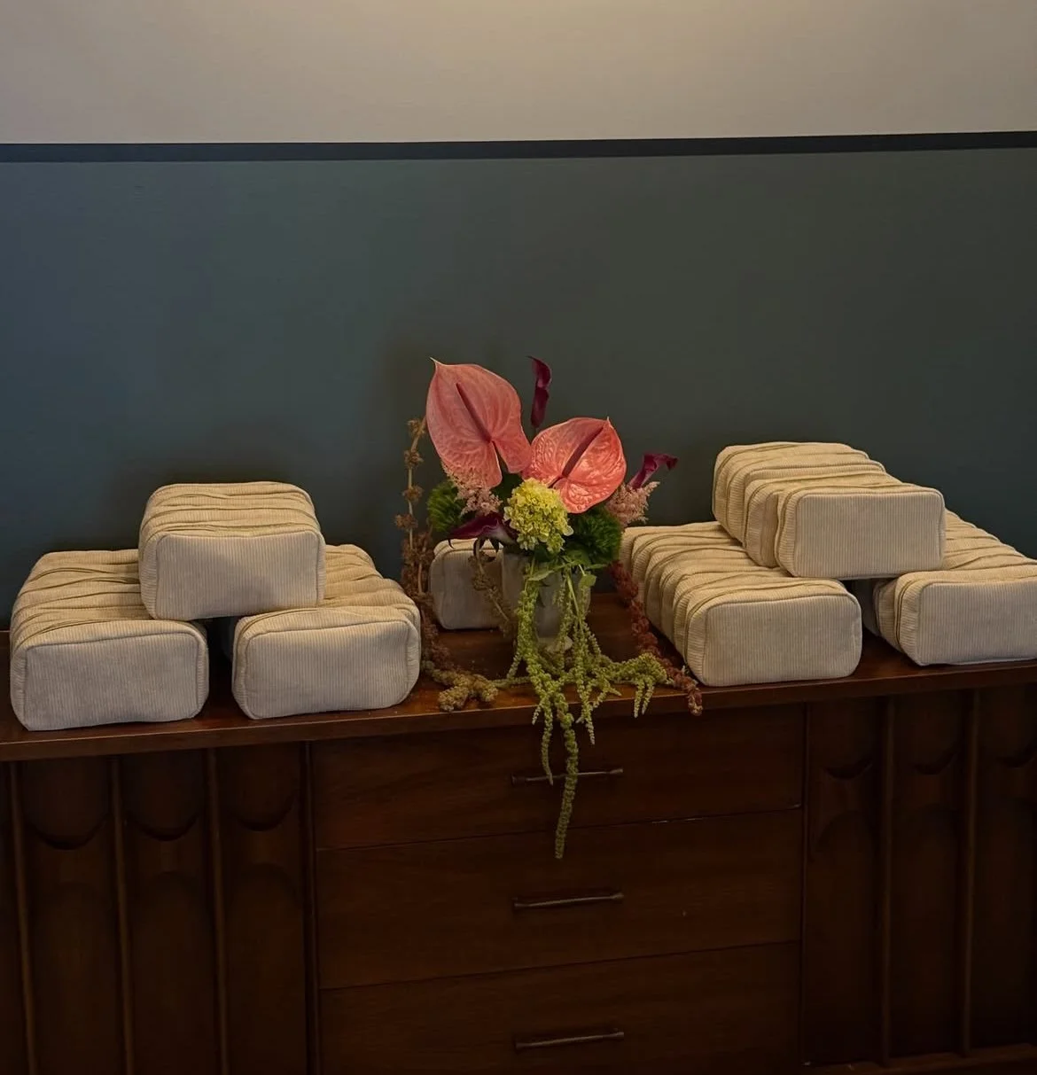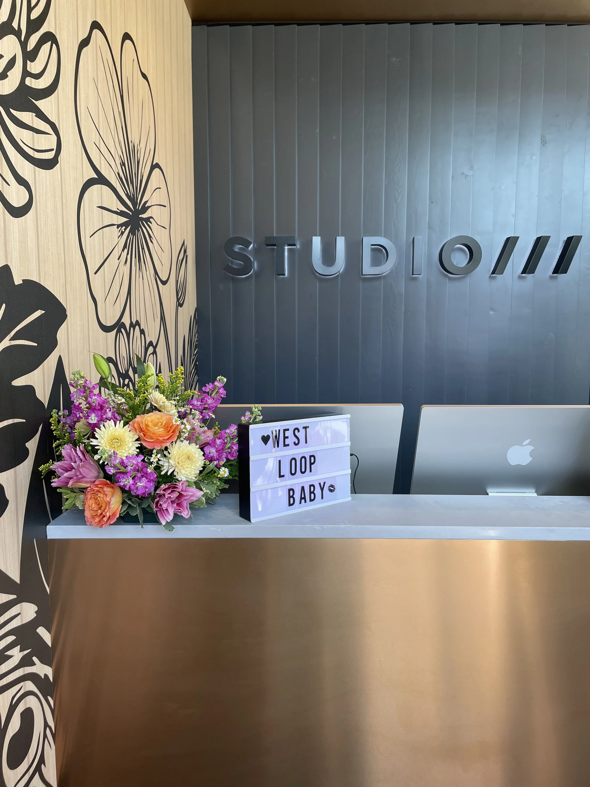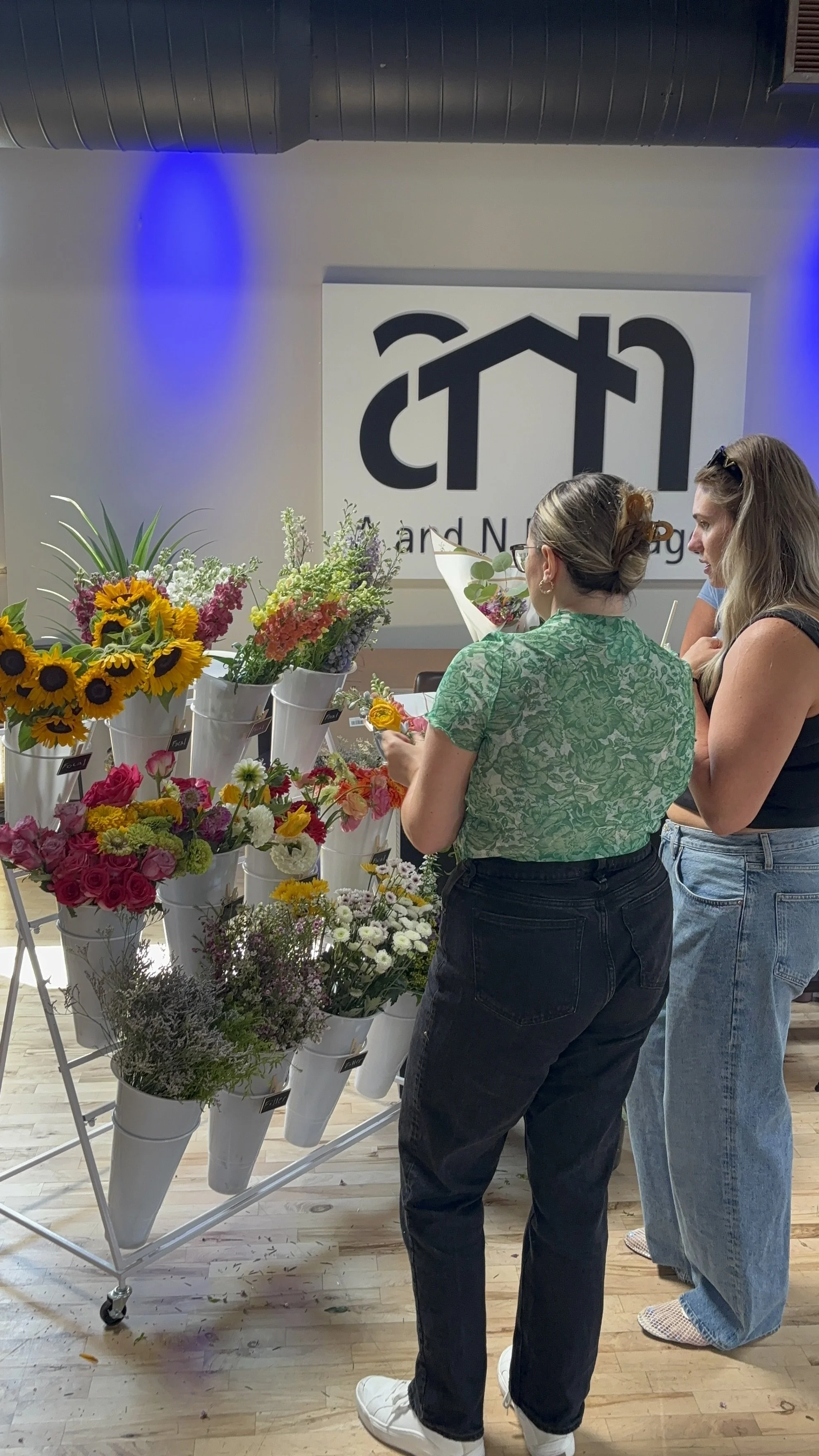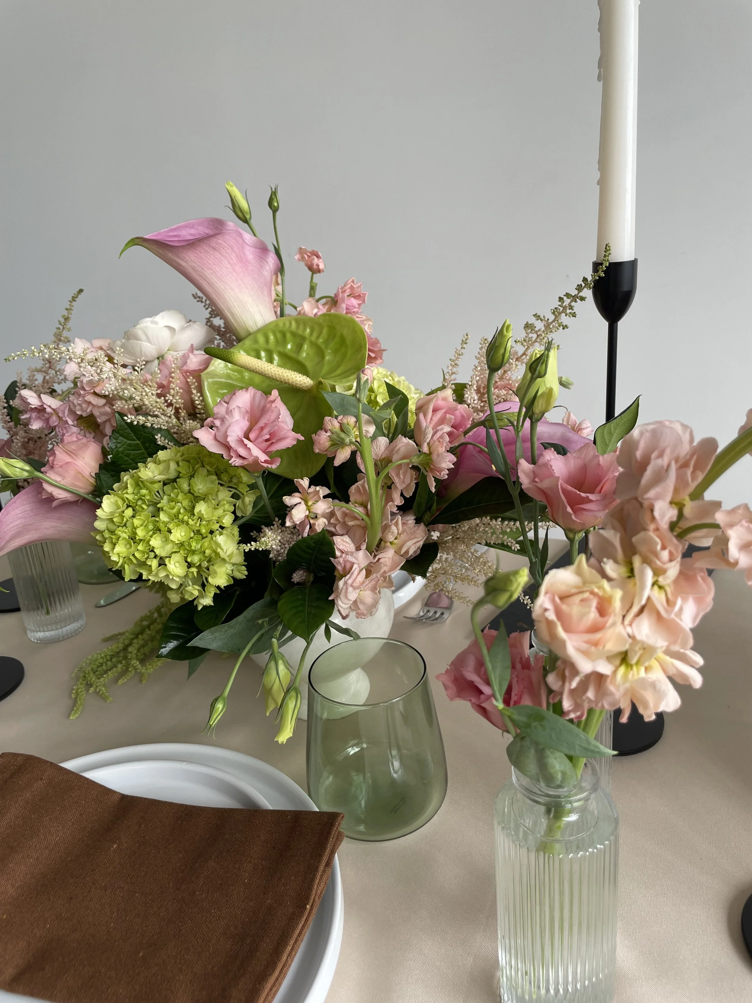 A flower arrangement with pink, orange, yellow, and blue flowers in a glass vase, a bowl with spoons, small bottles of green juice, and a stack of napkins on a table in front of a wall with a logo that says 'SSWN Studio'.