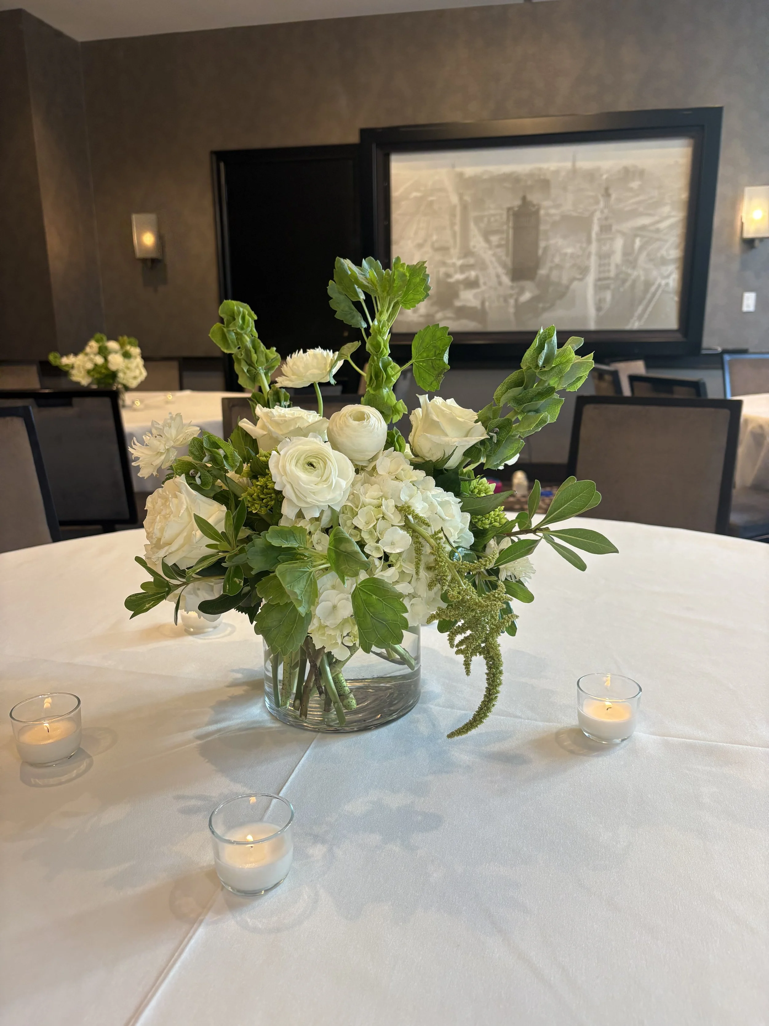 Table set with floral centerpieces, glassware, and a gold table number card showing the number 8 for a formal event or wedding.