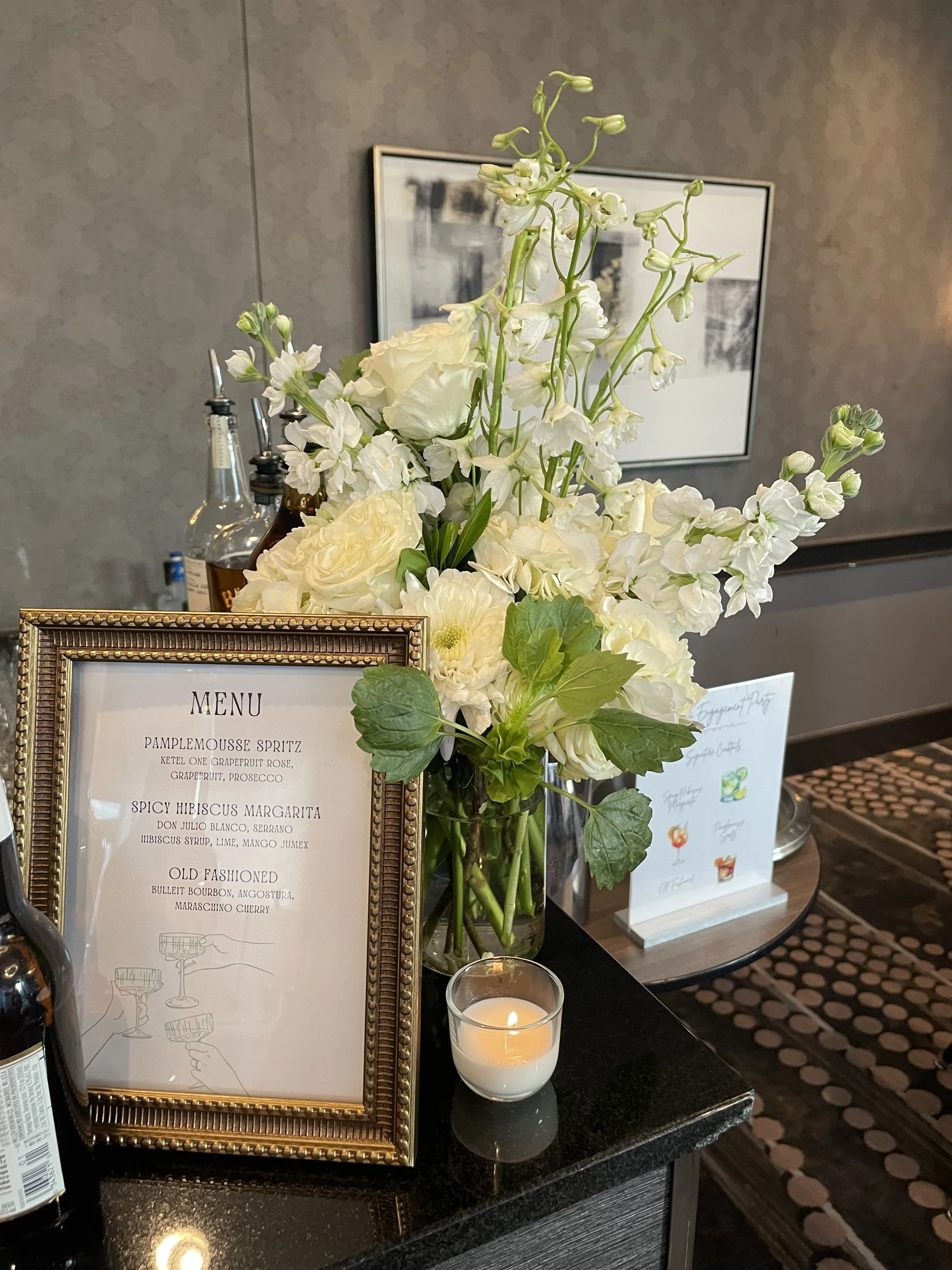 Decorative backdrop with large beige letters spelling 'BUNNY' hanging amidst hanging flowers and string lights, with a table and two chairs in front adorned with a colorful floral arrangement at an event space.