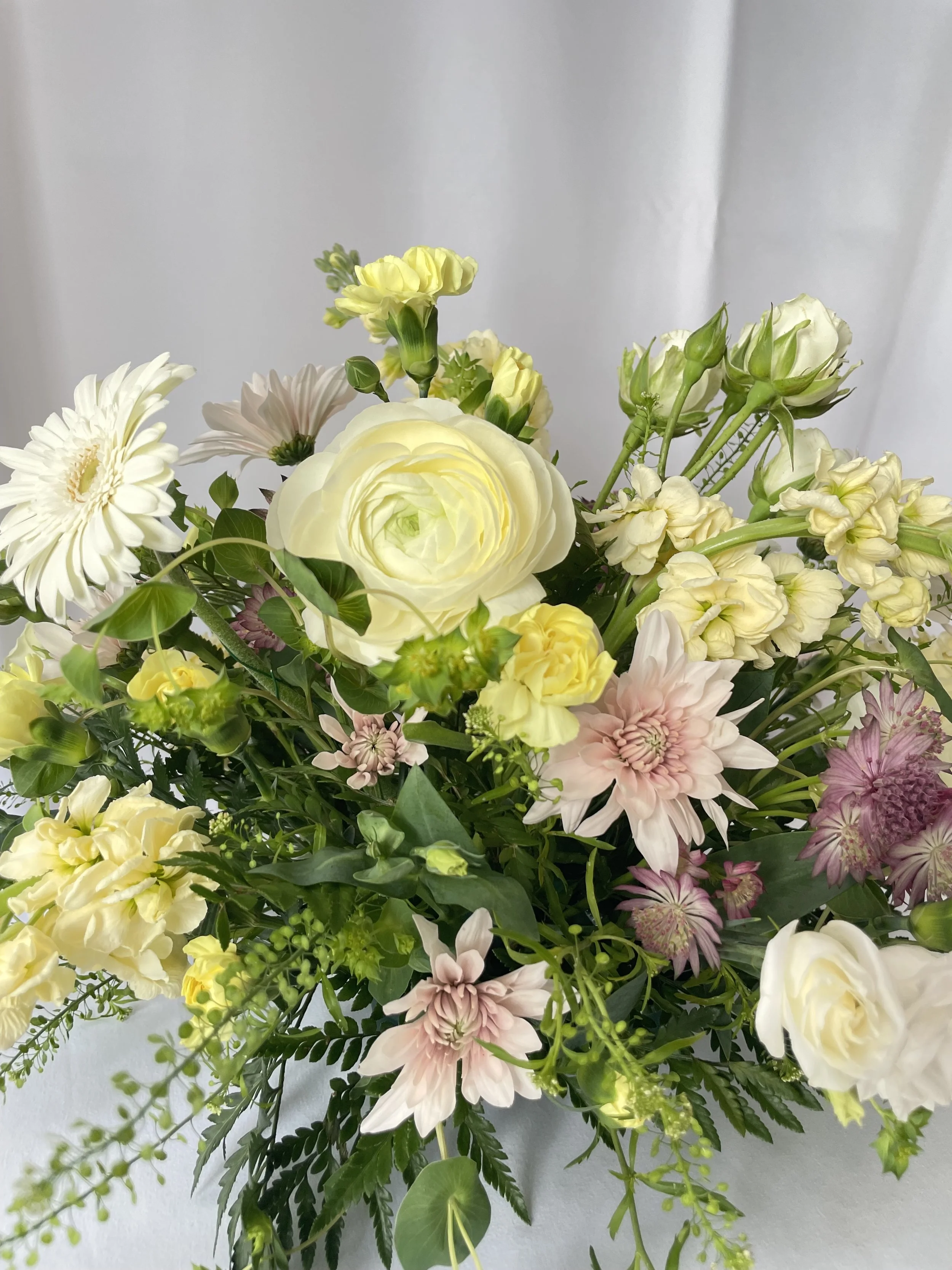 Multiple bouquets of mixed flowers wrapped in white paper with light brown edges, featuring orange roses, white chrysanthemums, purple bells, yellow craspedia, and green foliage.